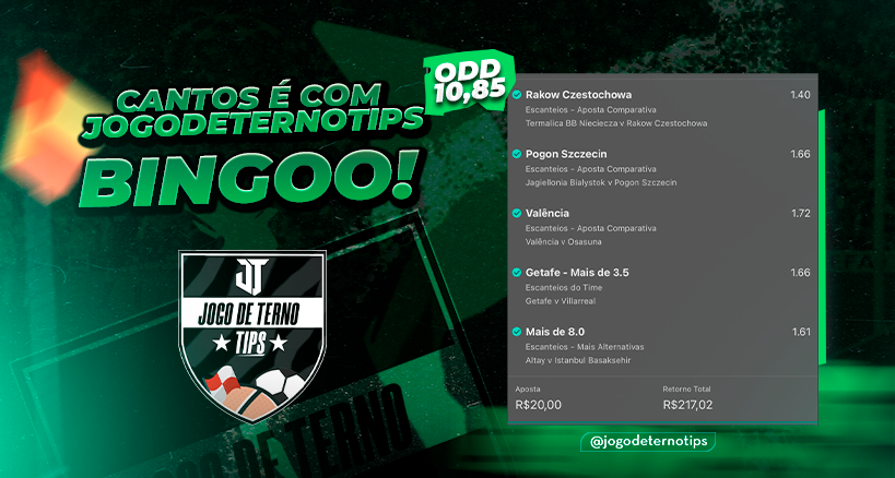 Grupo JOGO DE TERNO TIPS é destinado para entradas FUTEBOL, Escanteios ( cantos totais, cantos limites, races ) e também para entradas em Basquete - mercado de perfomance da NBA! Trabalhamos com entradas PRÉ e LIVE.